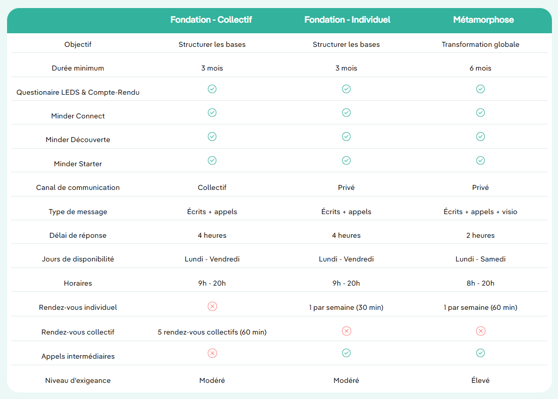 Les programmes The Minder reposent ensuite sur un abonnement de suivi personnalisé selon la Méthode LEDS avec un Minder dédié.